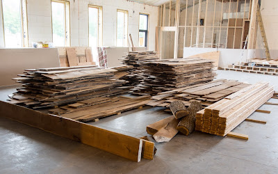 Early in the week a stack of trim boards from the big, blue container appeared inside the building. By Saturday the stack inside had grown considerably.
